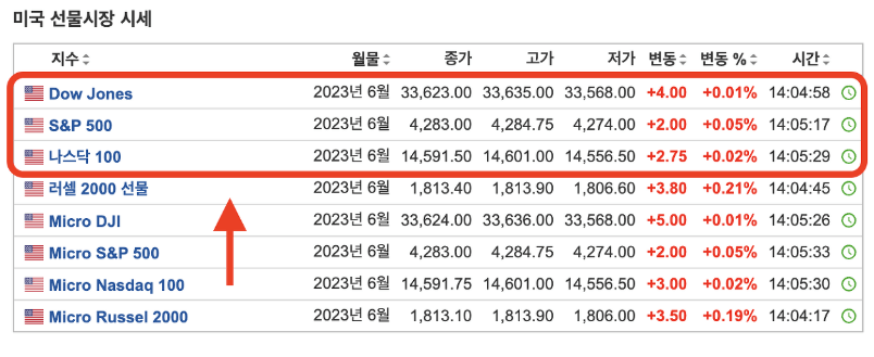 선물지수 페이지를 방문해 맨 위로 다우지수, 나스닥지수, S&P500 선물지수를 실시간으로 확인하고, 이들을 선택하면 차트와 상세 동향을 볼 수 있습니다.
