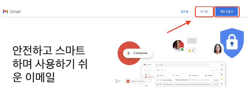 위의 열기 버튼을 활용해서 지메일 바로가기 홈페이지로 들어가면 오른쪽 상단에 계정 생성 및 로그인 버튼이 있습니다.