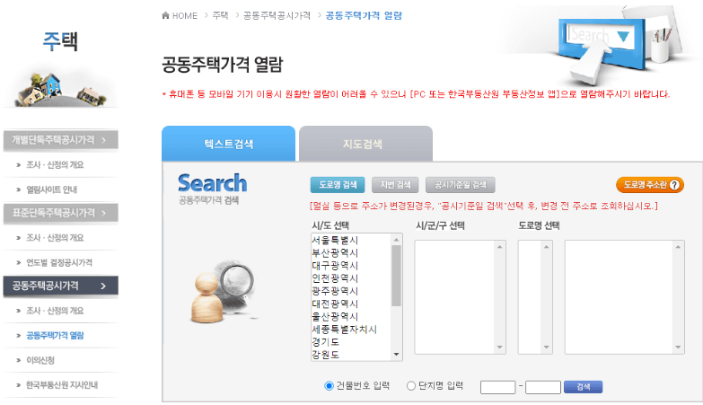 첫 화면 상단부터 왼쪽 메뉴 3개는 주택 공시가격 조회, 오른쪽 메뉴 2개는 토지 공시지가 조회입니다.