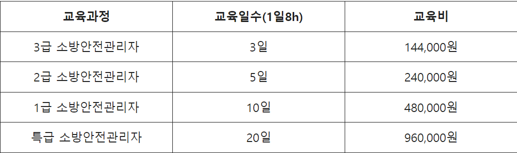 교육 일정 및 수강료는 한국소방안전원의 교육과정에 따라 다릅니다.